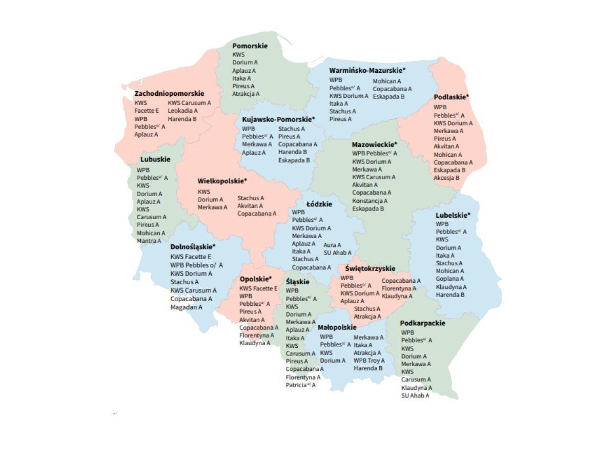 Poniżej zamieszczamy krótką charakterystykę kilku odmian w kolejności od najczęściej rekomendowanych (wg Listy opisowej COBORU), a na mapie pełną listę rekomendacji. Województwa, które przedstawiły aktualne rekomendacje na 2026 r. oznaczone są gwiazdką „*”. W przypadku pozostałych są to listy na 2025 r.