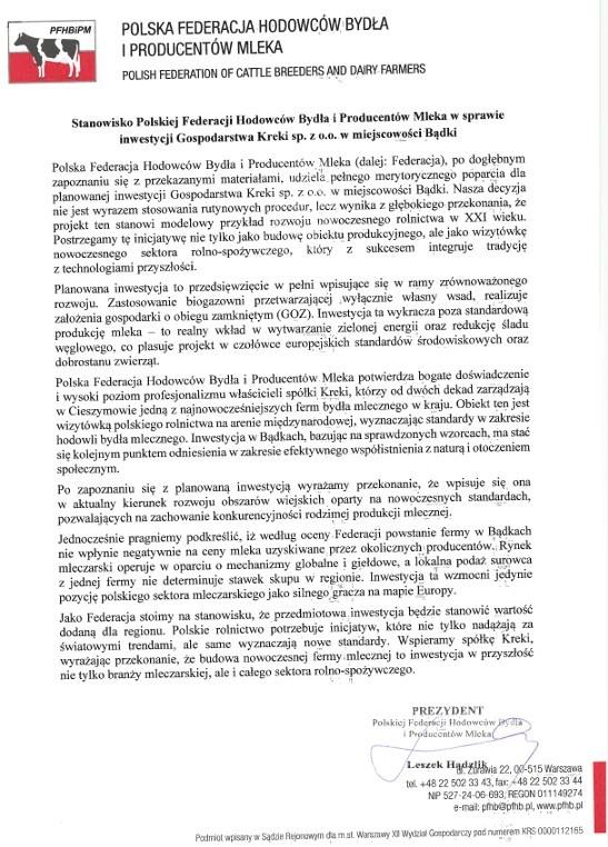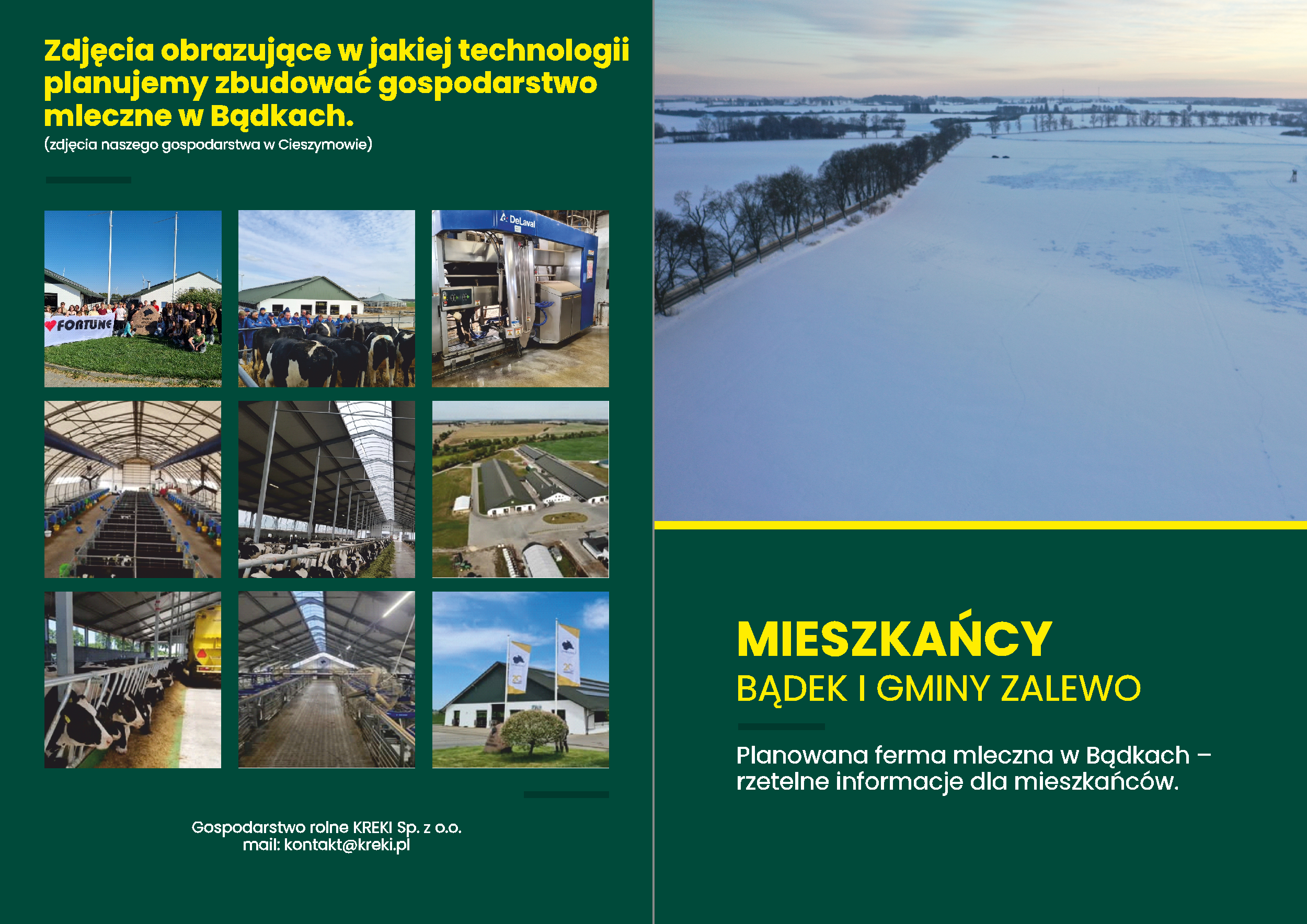 – Od ponad 20 lat prowadzimy znacznie większe, od planowanego w Bądkach, gospodarstwo mleczne w Cieszymowie, które jest wizytówką regionu odwiedzaną przez krajowych jak i zagranicznych gości i współpracującą ze szkołami rolniczymi. Nasze gospodarstwo w Cieszymowie to ferma z największym na świecie systemem doju grupowego. Na przykładzie tego gospodarstwa, stosując najlepsze światowe rozwiązania, chcemy wybudować mniejszą fermę w Bądkach. Nasze dotychczasowe doświadczenie hodowlane potwierdza, że zastosowanie takich rozwiązań skutecznie ograniczy wpływ gospodarstwa na najbliższą okolicę – zaznaczają właściciele Gospodarstwa KREKI Sp. z o.o., które zajmuje się planowaną inwestycją.
