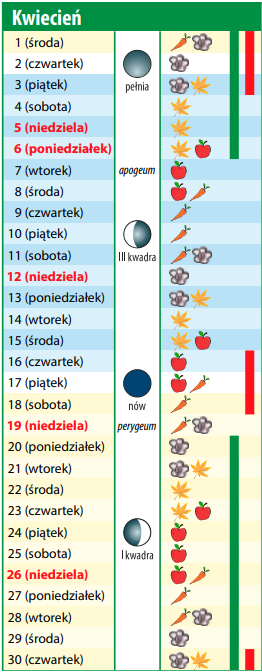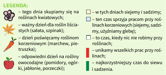 W dni z symbolem kwiatu w miejscach dobrze nasłonecznionych wysiewamy kwiaty jednoroczne oraz sadzimy byliny, drzewa i krzewy ozdobne. Dni liścia to czas sadzenia rozsady warzyw liściowych, kapusty, kalarepy, a na rabatach i rozsadniku wysiewamy nasiona tych warzyw, które chcemy zbierać w późniejszym czasie.