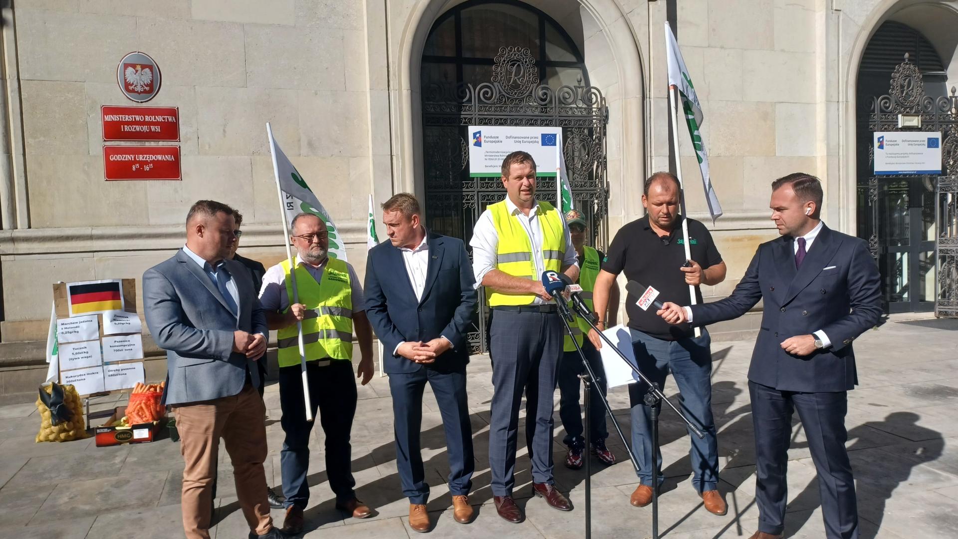 Podczas konferencji Solidarności Rolników Indywidualnych pod gmachem ministerstwa rolnictwa doszło do gorącej sceny. Rolnicy przyszli z workiem niemieckich ziemniaków, które – jak podkreślają – zalewają polski rynek i są sprowadzane za grosze, przez co polski rolnik nie ma gdzie sprzedać własnych plonów. Chcieli zostawić je ministrowi Stefanowi Krajewskiemu. Ochrona nie pozwoliła im wejść do gabinetu, więc rozwścieczeni gospodarze rzucili worek o podłogę. Ziemniaki i kapusta rozsypały się po holu ministerstwa.