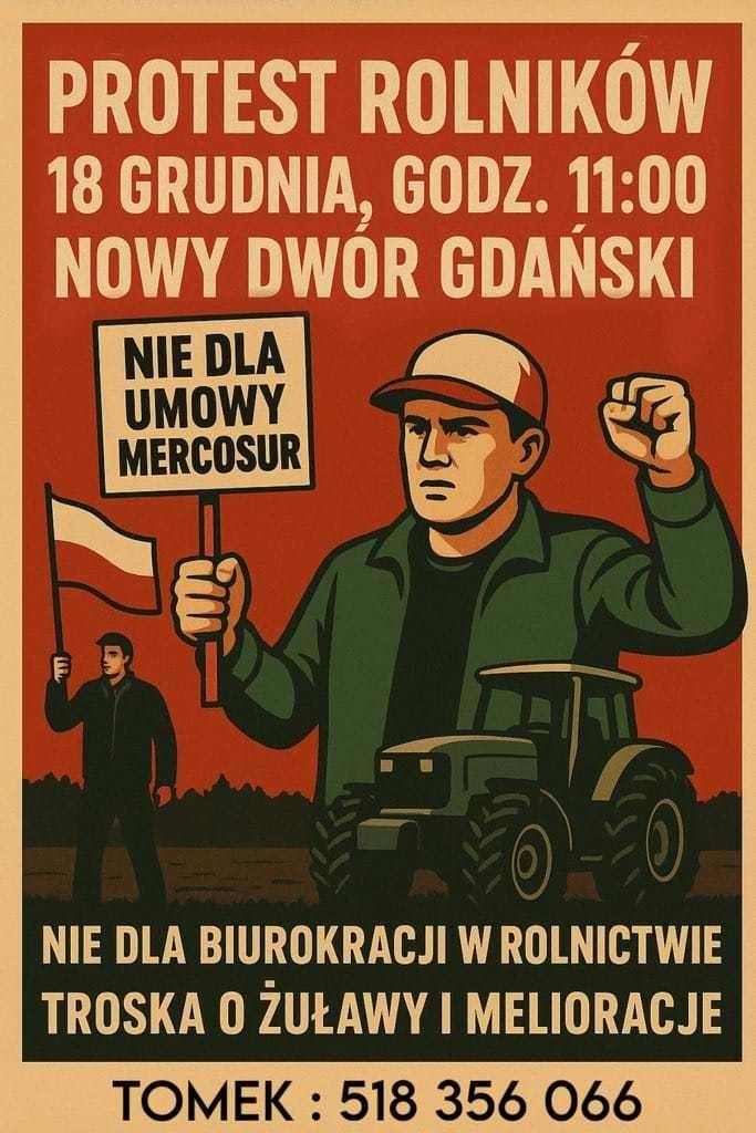 Rolnicy z okolic Nowego Dworu Gdańskiego zapowiadają protest, który odbędzie się 18 grudnia o godzinie 11:00. Demonstracja będzie miała charakter pokojowy, bez blokowania miasta, ale jej organizatorzy chcą wyraźnie pokazać swój sprzeciw wobec polityki rolnej i handlowej UE i polskiego rządu. Spodziewają się od kilku do nawet stu ciągników.