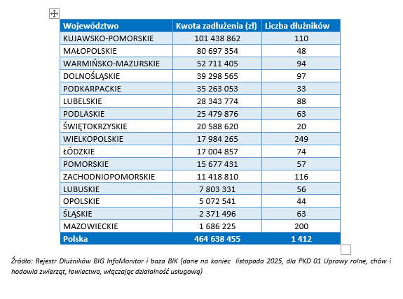 Problemy z opłacalnością produkcji coraz częściej przekładają się na trudności płatnicze. Dane z Rejestru Dłużników BIG InfoMonitor oraz bazy BIK pokazują, że łączna kwota zaległych zobowiązań w rolnictwie wynosi 646,1 mln zł.