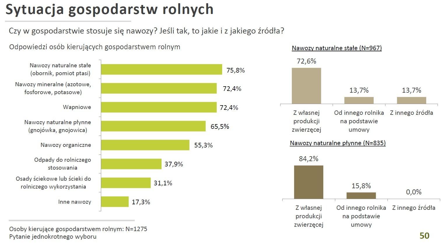 Jeżeli natomiast chodzi o nawozy naturalne płynne, to przytłaczająca większość rolników (84,2%) zadeklarowała, że pochodzą z własnej produkcji zwierzęcej, a 15,8% – od innego rolnika na podstawie umowy.