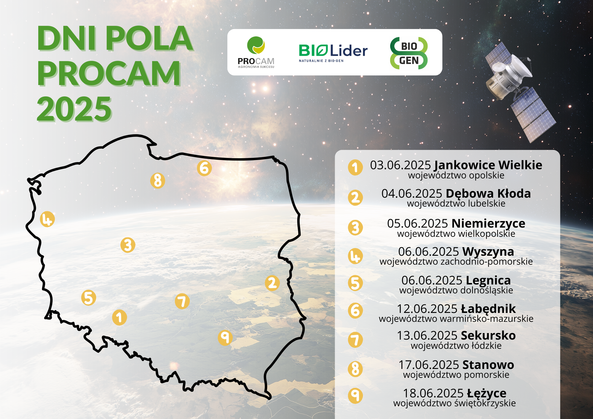 Dni Pola PROCAM to spędzony czas na polu z Agronomami PROCAM i innymi producentami rolnymi, gdzie w jednym miejscu można porównać odmiany zbóż i rzepaku, poszerzyć swoją wiedzę na temat ochrony i odżywiania roślin, a także dowiedzieć się więcej na temat innowacyjnych produktów mikrobiologiczych w uprawie roślin, tj.: BaktoTarcza, AzotoPower, FosfoPower, Rewital Pro+ czy DeliaSTOP.