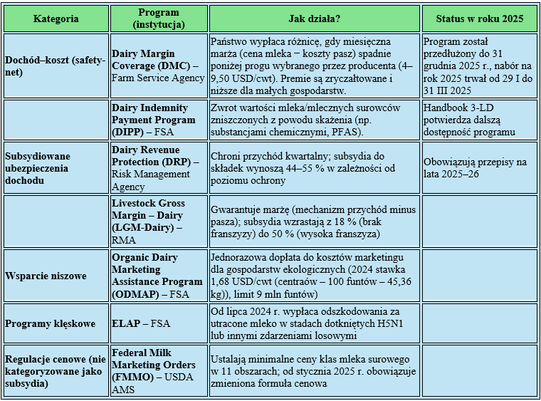 Podsumowując nadal kluczowym narzędziem jest system regulujący marże (Dairy Margin Coverage), niemniej dla większych gospodarstw coraz ważniejsze stają się ubezpieczenia DRP i LGM z państwową dopłatą do składek. Dodatkowe strumienie wsparcia (DIPP, ELAP, ODMAP) adresowane są w wyniku wystąpienia specyficznych ryzyka i zdarzeń, jak skażenia, katastrofy naturalne i rynkowe turbulencje w segmencie produkcji ekologicznej.
