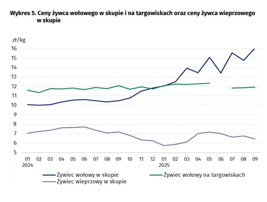 Najmocniej poszły w górę produkty mięsne. Żywiec wołowy w skupie osiągnął średnio 16,04 zł za kilogram. To aż 53% więcej niż przed rokiem i 8,6% więcej niż miesiąc wcześniej. Natomiast drób rzeźny trzymał się mocno, cena to 6,69 zł/kg, czyli o 20% więcej rok do roku. Zdecydowanie gorzej wyglądałą sytuacja wśród producentów zboża i ziemniaków.