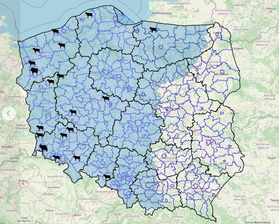 Złe wieści dla rolników. Choroba niebieskiego języka znowu daje o sobie znać. Główny Inspektorat Weterynarii potwierdził kolejne dwa ogniska zakażeń w stadach bydła. Tym razem pozytywne wyniki odnotowano na Dolnym Śląsku i w Zachodniopomorskiem, a zasięg stref objętych ograniczeniami obejmuje już ponad 2/3 terytorium Polski.