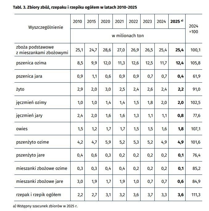 Całkowite zbiory zbóż podstawowych z mieszankami zbożowymi oszacowano na 25,4 mln ton, co oznacza symboliczny wzrost o 0,1% w stosunku do roku ubiegłego. Ten wzrost zawdzięcza się głównie zbożom ozimym – ich zbiory szacuje się na 21,7 mln ton, czyli o 0,6 mln ton (3%) więcej niż w 2024 roku. Z kolei zboża jare wypadły słabiej – 3,7 mln ton, co stanowi spadek o 0,5 mln ton, czyli aż 12% w porównaniu z rokiem ubiegłym.