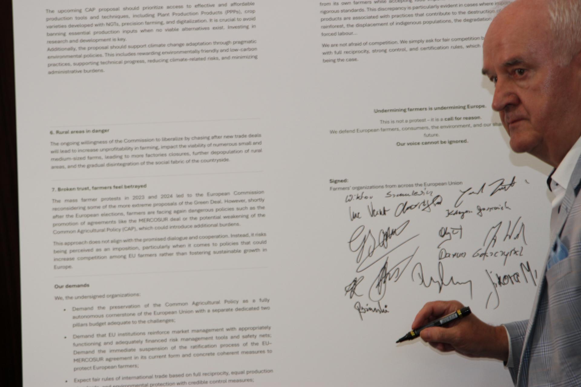 Sygnatariusze deklaracji domagają się i zwracają uwagę między innymi: – na niezbędność utrzymania w pełni autonomicznej Wspólnej Polityki Rolnej, z odrębnym budżetem, – na konieczność natychmiastowego wstrzymania procesu ratyfikacji umowy UE–Mercosur w jej obecnej formie, – na potrzebę podjęcia działań chroniących europejskich rolników i uczciwych reguł handlu międzynarodowego, opartych na wzajemności, równości standardów i ochronie środowiska z wiarygodnymi środkami kontroli, – na fakt, że zwiększenie kontyngentów taryfowych w ramach zakończonych negocjacji handlowych UE–Ukraina przeprowadzone zostało bez konsultacji ze środowiskiem rolniczym a nowe, zaproponowane limity importowe obejmują szereg produktów wrażliwych, w szczególności cukier i miód, co może mieć poważne konsekwencje dla unijnych producentów.