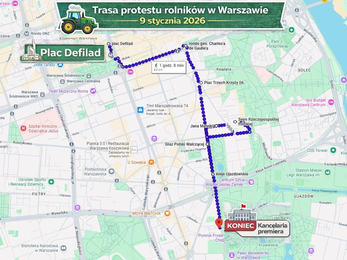 Protest rolników w Warszawie 9 stycznia 2026. MAPA MARSZU