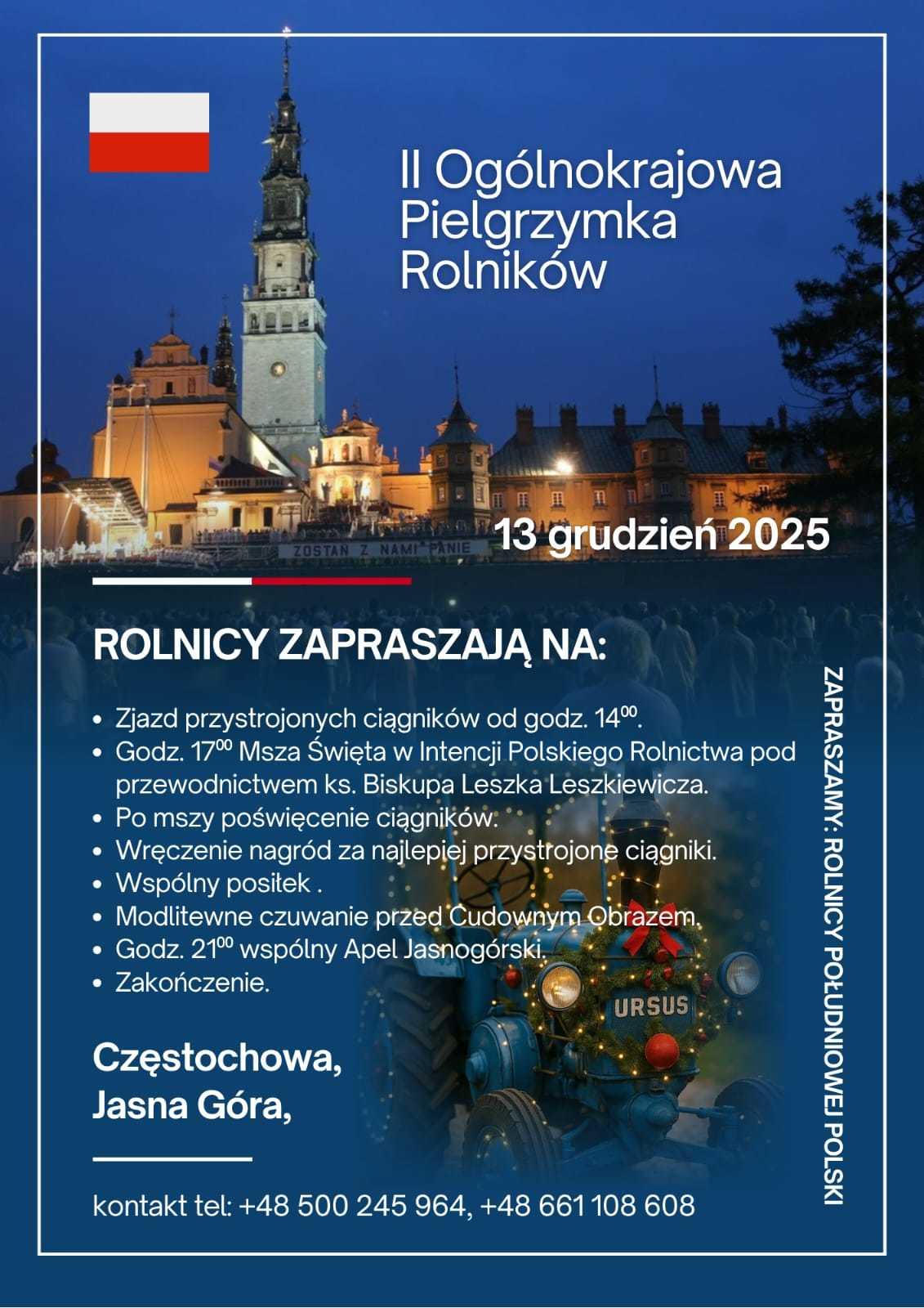 - 13 grudnia o godz. 17.00 spotkajmy się wszyscy na Jasnej Górze, by dziękować za urodzaj, za każde ziarenko, za bydło na pastwiskach, za chleb na naszym stole. Niech druga już msza w imieniu polskiego rolnictwa będzie wielkim, braterskim spotkaniem polskiej wsi. Niech z każdego zakątka Polski popłyną głosy wdzięczności za to, że Ziemia nas karmi i że Pan Bóg ją chroni. Niech staną obok siebie ojcowie i synowie, młode ręce, które dopiero uczą się tej ziemi i te zapracowane. Niech młodzi zobaczą, że to coś więcej niż zawód, to służba Bogu i ludziom, zakorzeniona głęboko w tej polskiej ziemi. Przybądźcie więc licznie traktorem, samochodem czy pieszo, z rodziną, z sąsiadem, z sercem, przepełnionym wiarą, bo kiedy rolnik dziękuję, dziękuję naród cały. A Polska znów rośnie w siłę, dlatego spotkajmy się na Jasnej Górze 13 grudnia o godzinie 17.00. Rolnicy razem z Bogiem, z Maryją z nadzieją - brzmią słowa piosenki, która powstała specjalnie na okazję Pielgrzymki na Jasną Górę.