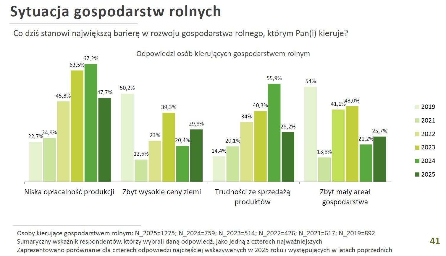 Z badania "Polska Wieś i Rolnictwo 2025" wynika, że wśród kluczowych barier rozwoju gospodarstwa rolnego, rolnicy wymieniają: niską opłacalność produkcji (47,7% wskazań ogółem), zbyt wysokie ceny ziemi (29,8% wskazań ogółem), brak chętnych do pracy w rolnictwie (28,8% wskazań ogółem), trudności ze sprzedażą produktów (28,2% wskazań ogółem) oraz zbyt mały areał gospodarstwa (25,7% wskazań ogółem).
