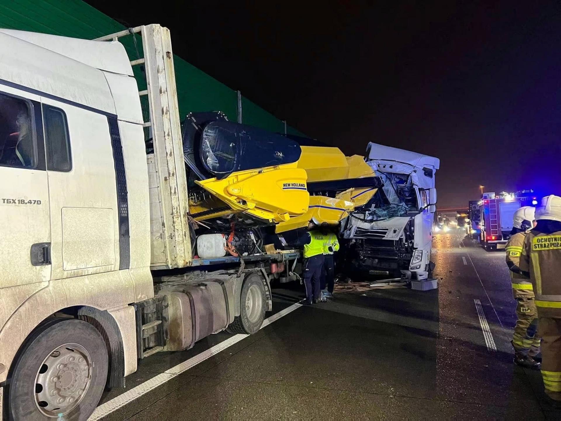 Choć wypadek kojarzy się zazwyczaj z kolizją aut osobowych, zdarzenia z udziałem transportu ciężkiego i maszyn wielkogabarytowych są znacznie trudniejsze do opanowania. W tym przypadku jeden z samochodów ciężarowych przewoził kombajn rolniczy.