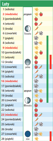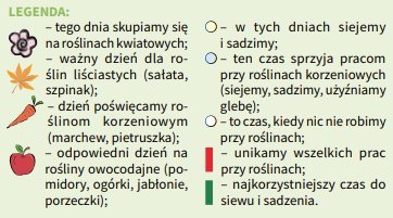 Zaopatrujemy się w nasiona sałaty, wczesnej kapusty, rzodkiewki, jarmużu, roszponki i wysiewamy je do inspektu bądź szklarni w dni liścia. Pędzimy korzenie pietruszki i cebulę na szczypior. Siejemy nasiona na kiełki i młode listki. W dni kwiatu wysiewamy nasiona żeniszków, begonii, szałwii, lwiej paszczy, pelargonii, petunii i innych gatunków wymagających długiego okresu wegetacji.