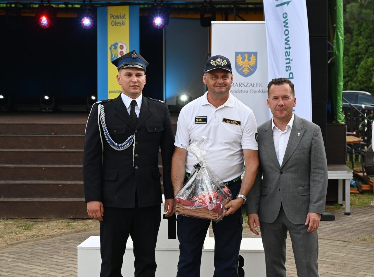 Od lewej: Marcin Jasiński, prezes OSP w Bobrowej, Jan Sivák, druh OSP z zaprzyjaźnionej gminy partnerskiej Soblahov, Mariusz Stanek, wójt gminy Rudniki