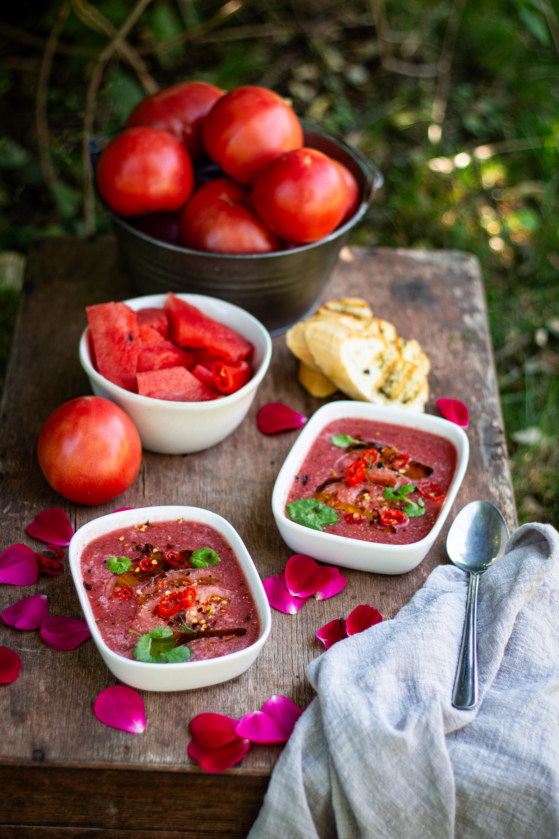 Składniki: 500 g dojrzałych pomidorów (obranych i pokrojonych), 300 g arbuza (pokrojonego, bez pestek), 1 mała czerwona papryczka chilli (bez pestek), 1 mały ząbek czosnku, sok z 1 limonki, garść świeżej kolendry, 2 łyżki oliwy z oliwek, sól i pieprz.