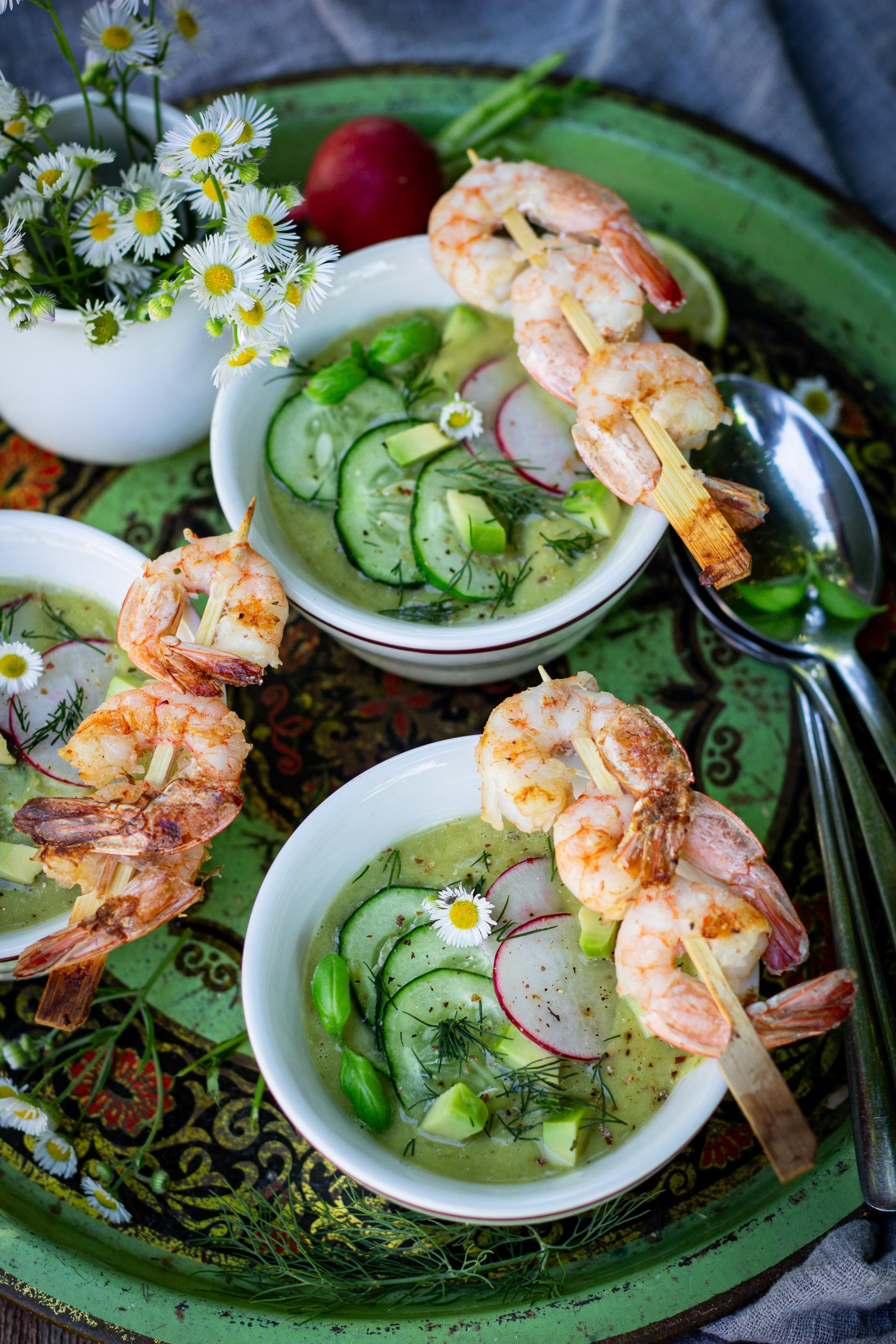 Składniki: 400 g zielonego groszku (świeżego lub mrożonego), 1 dojrzałe awokado, 1 mały ogórek, 500 ml chłodnego bulionu warzywnego, garść świeżej bazylii, sok z 1 limonki, sól i pieprz do smaku, 2 łyżki oliwy z oliwek; dodatkowo: kilka rzodkiewek, świeży ogórek, 1/2 awokado, świeża bazylia, koperek, krewetki, sól, pieprz, oliwa z oliwek.