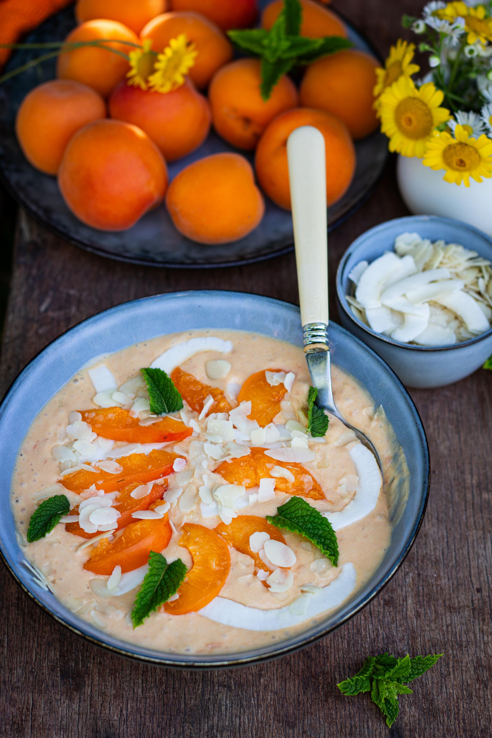 Wykonanie: Zblendować morele, mleko kokosowe, miód i ekstrakt waniliowy na gładką masę. Schładzać w lodówce przez minimum godzinę. Podawać z posypanymi prażonymi migdałami, płatkami kokosowymi, listkami mięty oraz kawałkami moreli.