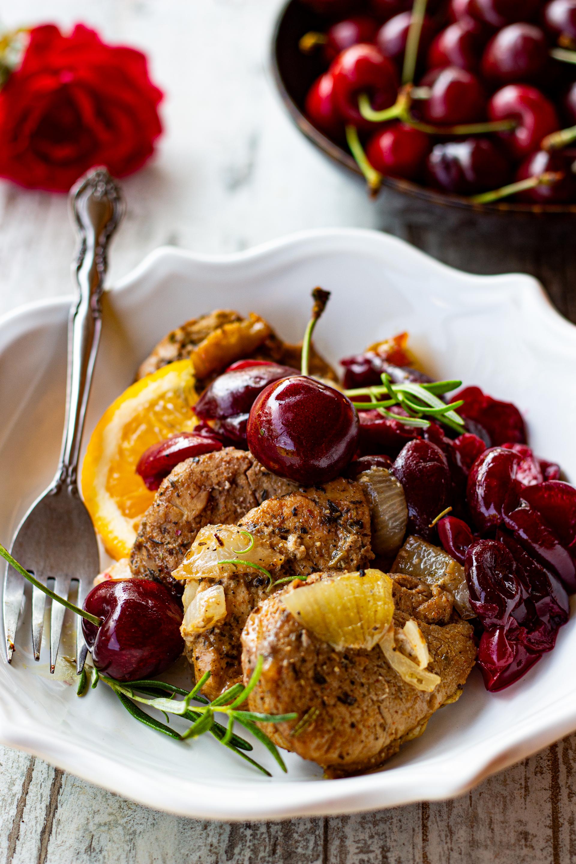 Wykonanie: Wymieszać pokrojone kawałki polędwicy z sosem teriyaki, czosnkiem, pieprzem i papryką. Odstawić na co najmniej 15 minut. Rozgrzać masło na dużej patelni. Dodać cebulę i zeszklić ją. Dodać kawałki polędwiczki, rozmaryn i smażyć na średnim ogniu przez 6–8 minut, aż się zrumienią z każdej strony. Zdjąć mięso z patelni i odstawić, cebulę pozostawić na patelni. Na tę samą patelnię wyłożyć czereśnie, wylać wino, sok z pomarańczy, ocet, miód, cukier, imbir, goździki, skórkę z cytryny, sól i pieprz. Gotować przez 10–15 minut, aż czereśnie zmiękną, a sos zgęstnieje. Usmażoną polędwicę podawać z sosem.