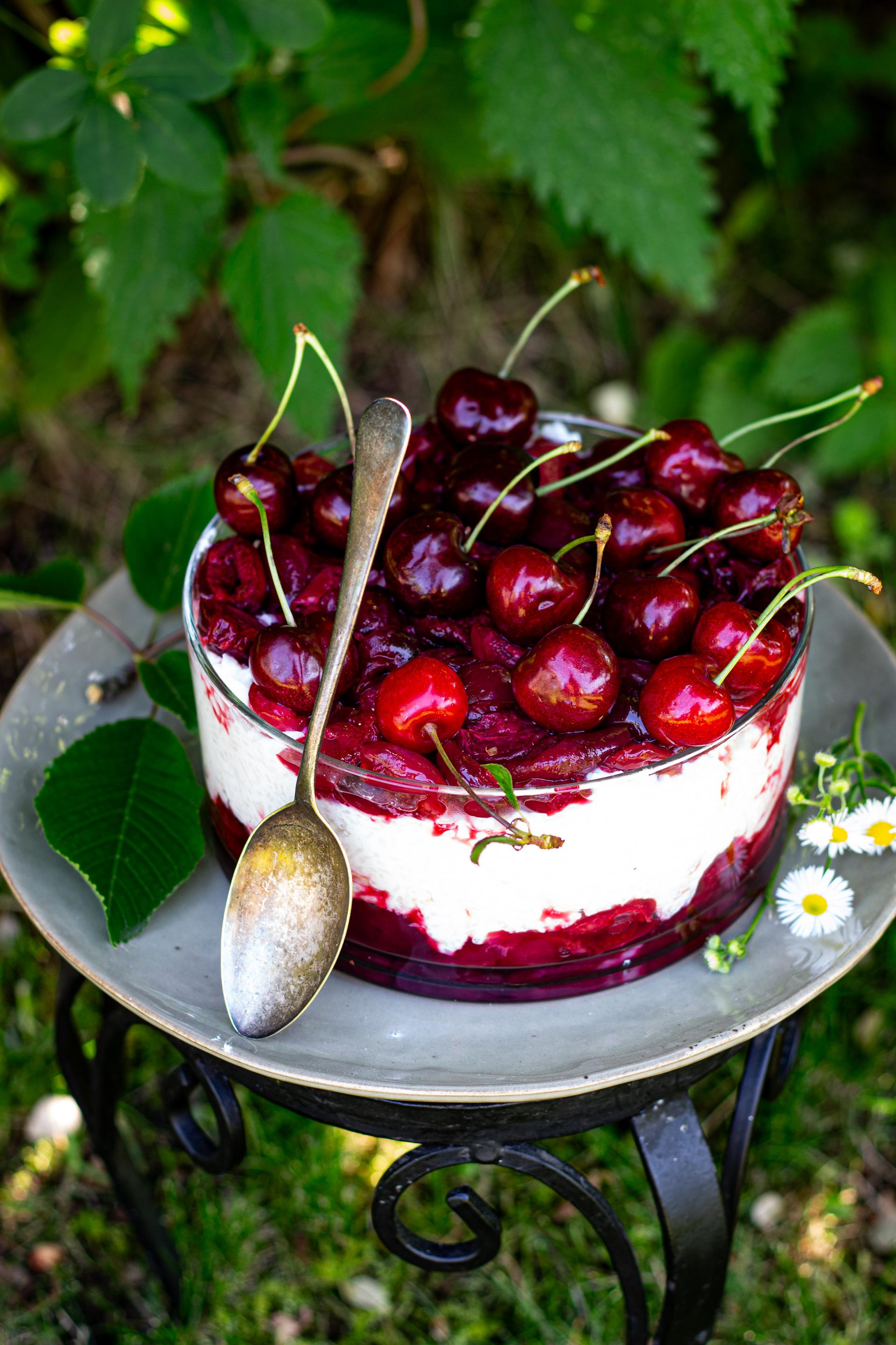 W rondelku podgrzać czereśnie z cukrem i rozmarynem. Gotować kilka minut, aż puszczą sok i lekko się rozpadną. Redukować sos przez 5–7 minut, aż lekko zgęstnieje. Wyjąć gałązki rozmarynu. Można dodać szczyptę cynamonu. Do szklanej salaterki włożyć połowę czereśni, a następnie cały pudding. Na wierzchu równomiernie rozprowadzić resztę czereśni. Udekorować świeżymi czereśniami. Schładzać przez minimum 1–2 godziny w lodówce, by deser był bardziej zwarty i odświeżający. Podawać z łyżką do nakładania – każdy nabierze warstwę puddingu i owoców. Deser najlepiej smakuje lekko schłodzony. Można przygotować go dzień wcześniej – jeszcze lepiej się „przegryzie”.
