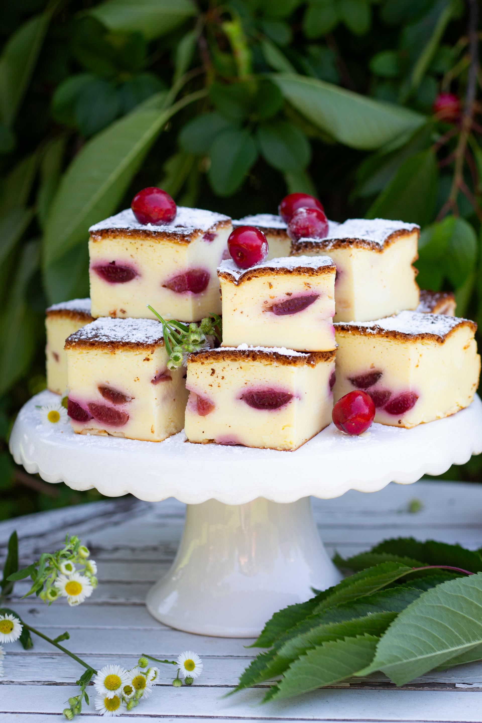 Składniki: 6 jajek, 1/4 łyżeczki soli, 170 g cukru, 2 łyżeczki cukru waniliowego, 4 łyżeczki cukru wanilinowego, 1 kg twarogu sernikowego z wiaderka, 180 g roztopionego masła, 350 g mleka, 200 g mleka w proszku, 80 g budyniu waniliowego w proszku, 200 g czereśni (wydrylowanych) + łyżka mąki ziemniaczanej, cukier puder do oprószenia.