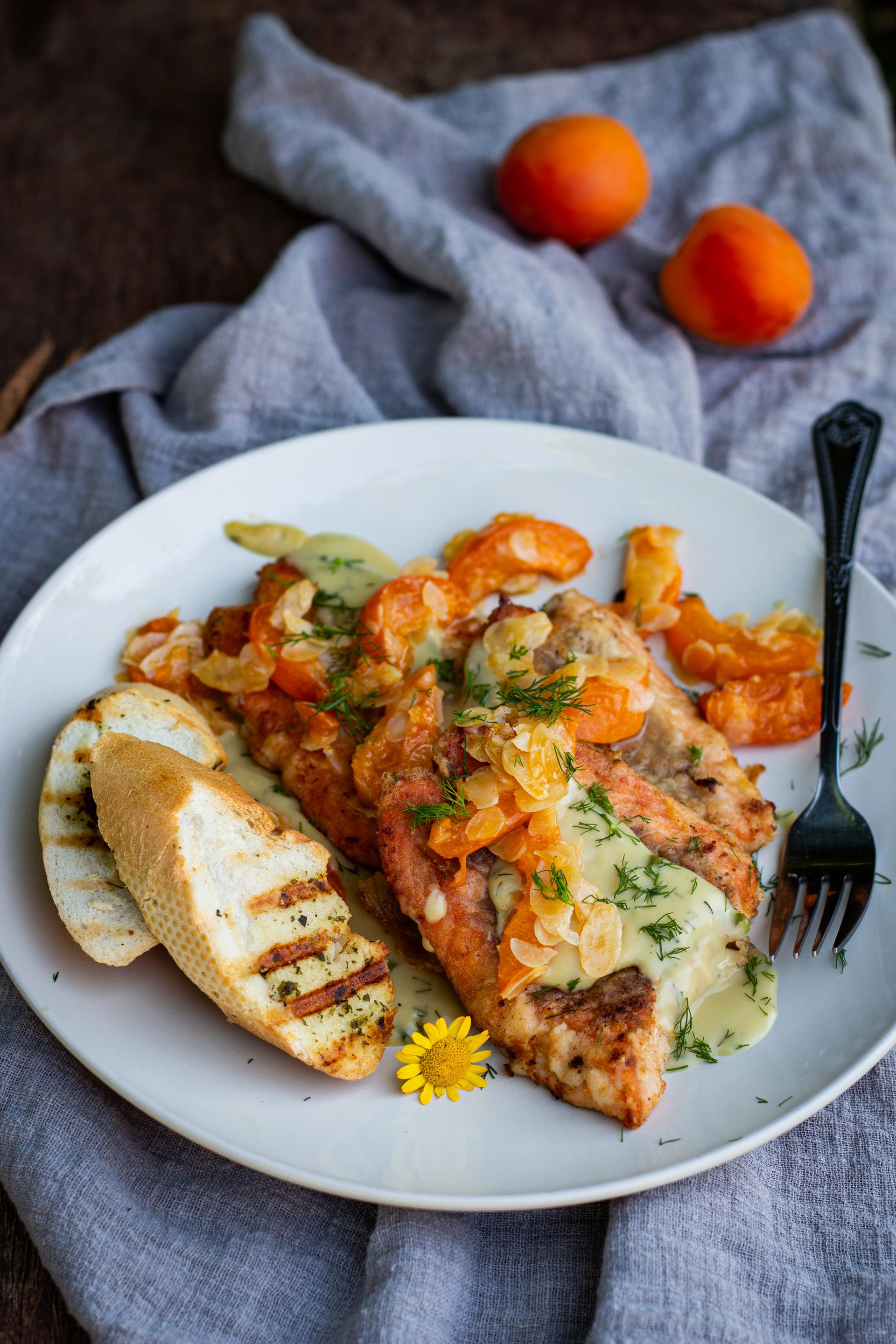 Wykonanie: Zagotuj bulion. W osobnym naczyniu wymieszaj śmietanę, mąkę, musztardę dijon, sos sojowy, sok z cytryny, imbir i pieprz. Dodaj mieszankę do bulionu, cały czas mieszając, aż sos zgęstnieje (5–7 minut). Zdejmij z ognia, wmieszaj masło, dopraw do smaku. Na patelni roztop masło na średnim ogniu. Dodaj świeże morele i smaż przez 2 minuty, aż zaczną lekko mięknąć. Dodaj miód i szczyptę soli, mieszaj delikatnie, by owoce się nie rozpadły. Dodaj płatki migdałowe i smaż przez kolejne 2 minuty, aż się lekko zarumienią. Oprósz filety solą i pieprzem. Obsmaż na rozgrzanym oleju (około 5 minut z każdej strony). Odstaw na chwilę, by mięso „odpoczęło”. Na talerzu ułóż filet łososia. Polej go sosem. Ułóż porcję duszonych moreli z migdałami. Udekoruj posiekanym koperkiem. Podawaj z dodatkiem grillowanych grzanek.