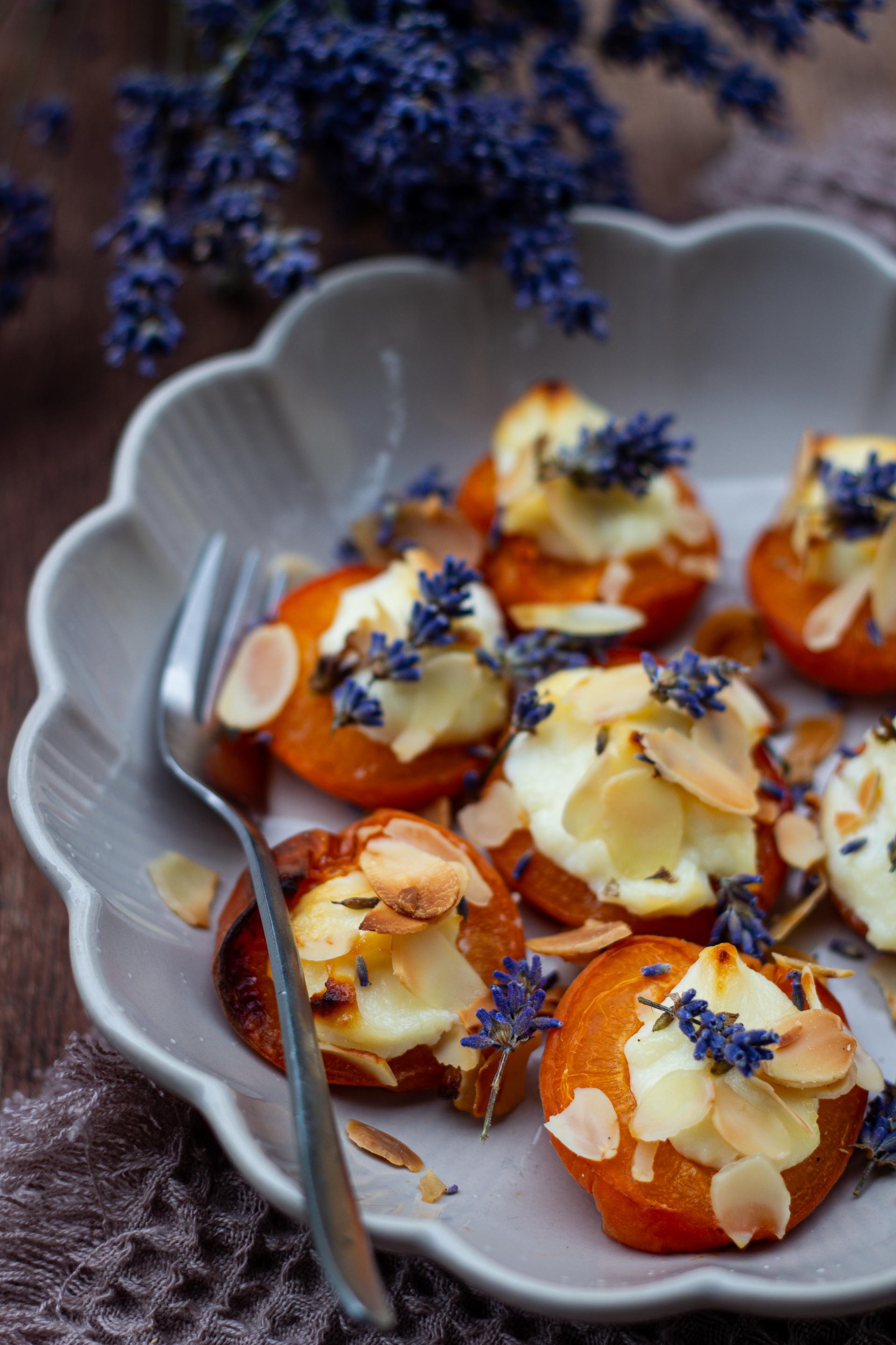Składniki: 8 dojrzałych moreli, 200 g ricotty, 3 łyżki miodu, 1 łyżeczka suszonej jadalnej lawendy (lub szczypta rozmarynu), garść płatków migdałowych.