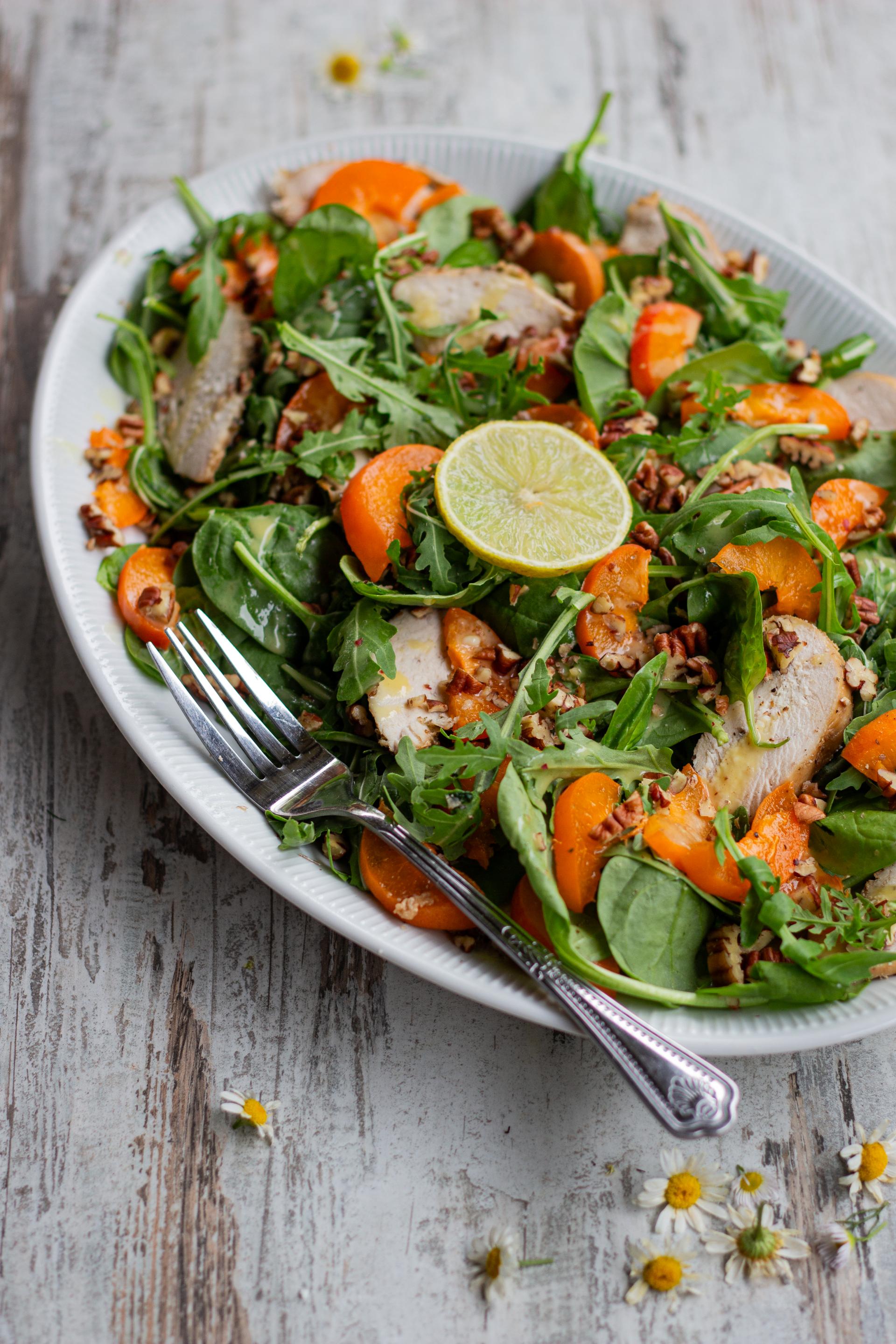 Składniki: 1 pierś z kurczaka, 3–4 świeże morele, garść rukoli, garść młodego szpinaku, garść orzechów włoskich lub pekan (uprażonych).