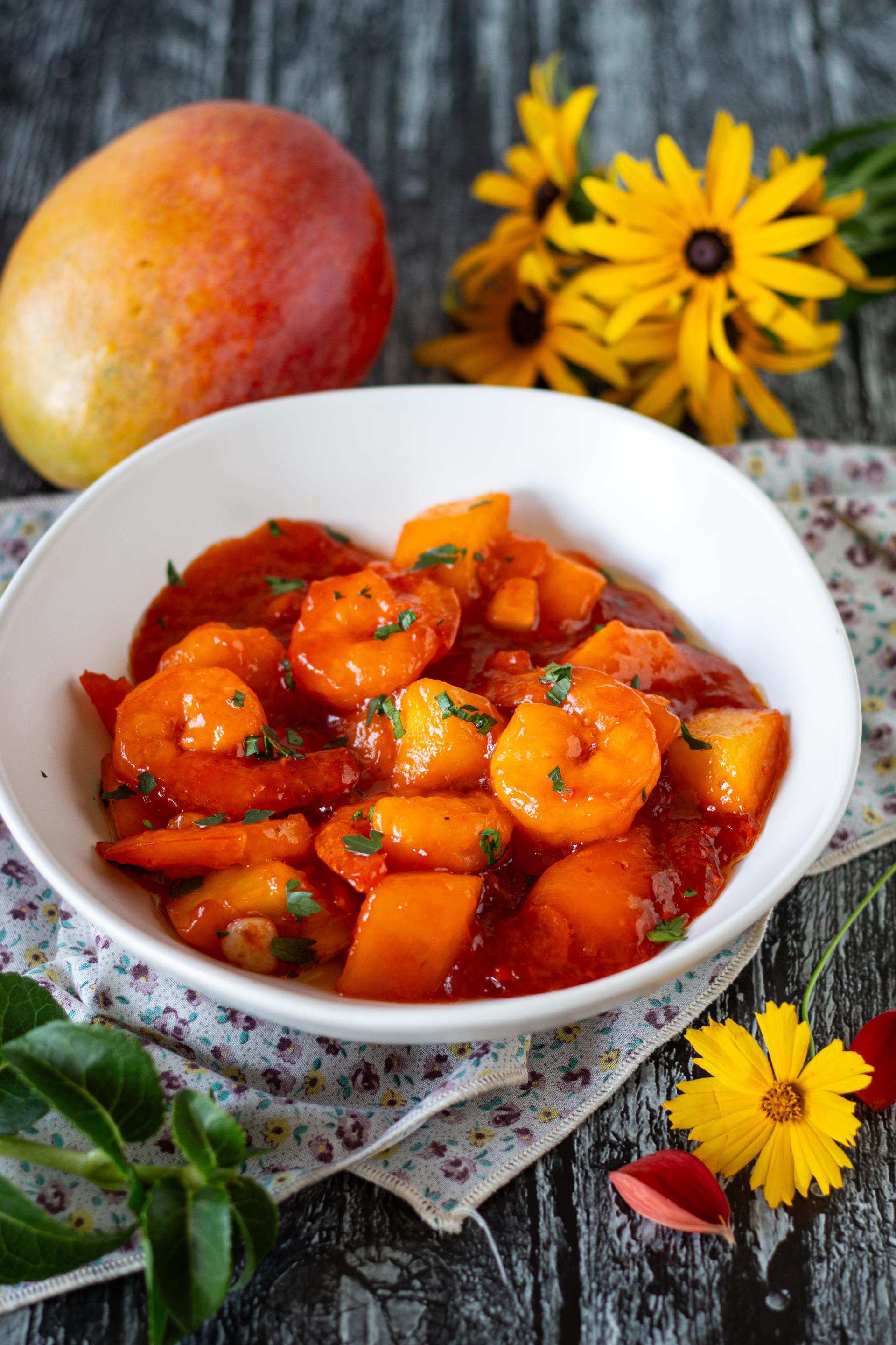 Wykonanie: W miseczce połącz sos rybny, sojowy, sok z limonki, słodki sos chili, wodę i skrobię. Odstaw. Na dużej patelni rozgrzej olej, dodaj imbir i czosnek – podsmaż krótko, aż uwolnią aromat. Wrzuć krewetki i smaż przez 2–3 minuty z każdej strony, aż będą różowe. Do krewetek dodaj pokrojone mango oraz przygotowany sos. Gotuj jeszcze 2–3 minuty, aż sos zgęstnieje i całość się połączy. Podawaj posypane kolendrą. Można dodatkowo skropić świeżym sokiem z limonki.