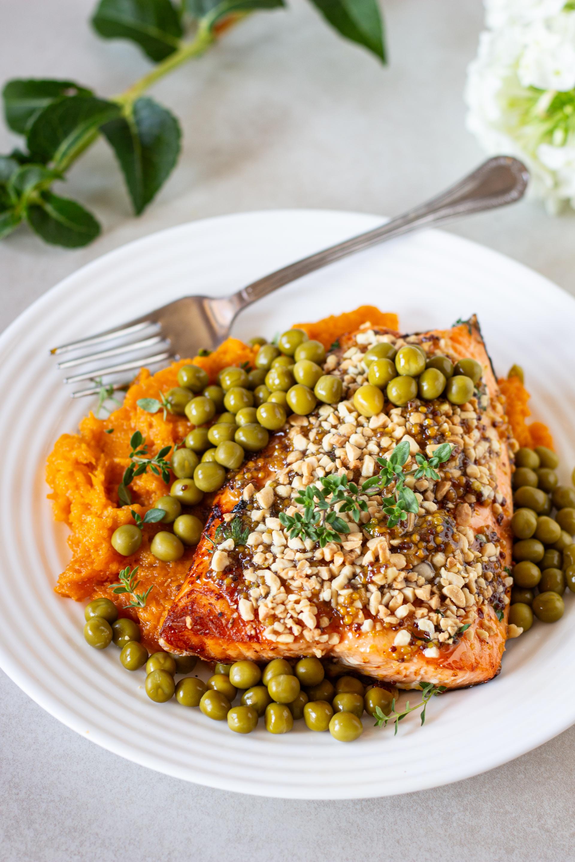 Składniki: 2 filety z łososia (po ok. 150–200 g), 1 łyżka musztardy Dijon, 1 łyżka miodu, 1 ząbek czosnku (przeciśnięty), 2 łyżki posiekanych orzechów ziemnych, sól, pieprz, 1 łyżeczka oliwy; 1 batat, 1 łyżka masła, groszek zielony konserwowy.