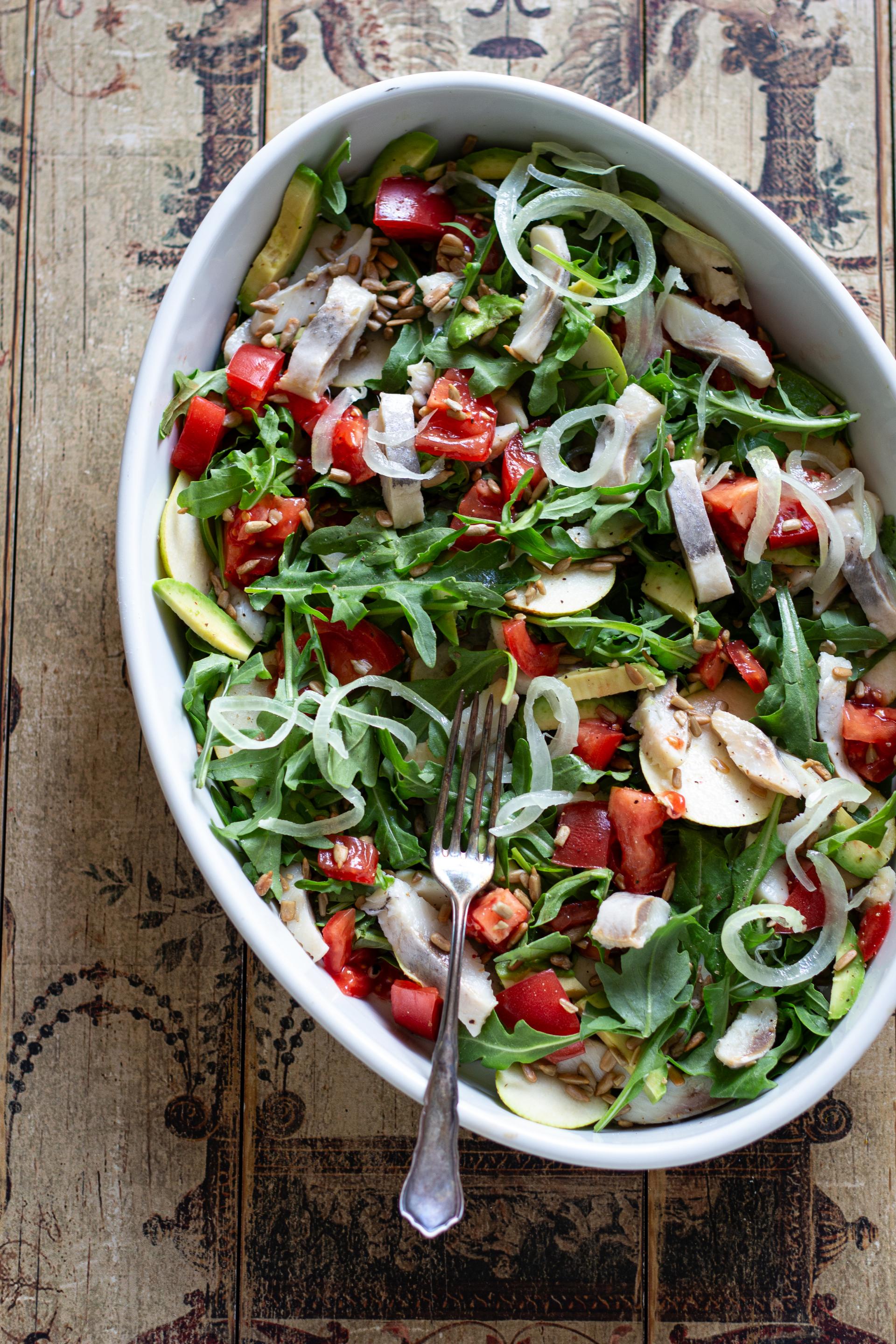 Składniki (na 2 porcje): 2 filety śledziowe (solone, dobrze wymoczone), 1 cebula, 1 dojrzała gruszka, garść rukoli, 2 łyżki ziaren słonecznika, 1 pomidor, 1 awokado, 1 łyżka oliwy, 1 łyżeczka soku z cytryny, świeżo zmielony pieprz.