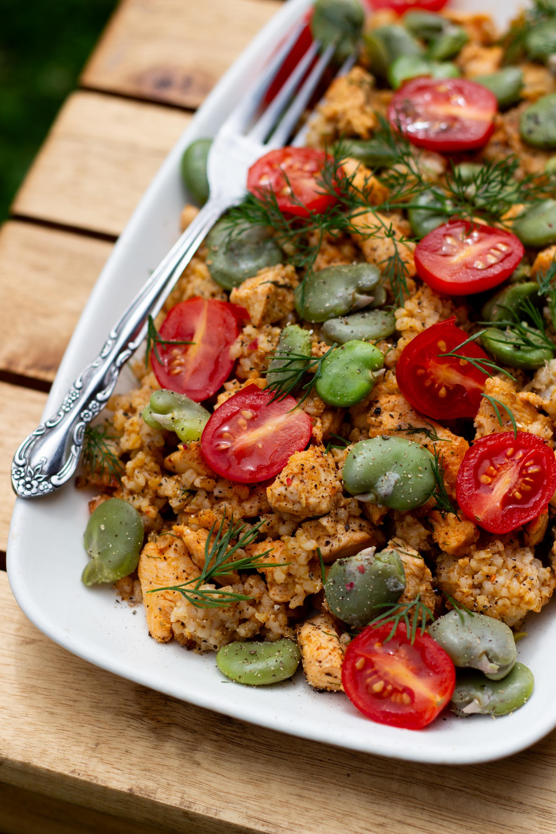 Składniki: 300 g kaszy jęczmiennej, 2 piersi z kurczaka, 300 g bobu (ugotowanego, świeżego lub mrożonego), około 20 pomidorków koktajlowych, 2 łyżki masła klarowanego, 2 ząbki czosnku, sól i pieprz do smaku, słodka papryka w proszku, pęczek świeżego posiekanego koperku.