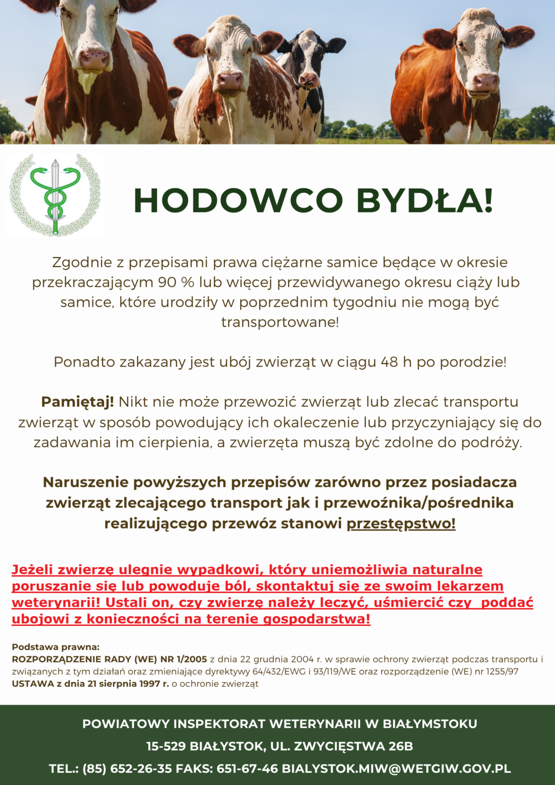 Powiatowy Lekarz Weterynarii w Białymstoku zaapelował do gmin, ARiMR i ośrodków doradztwa rolniczego o rozpowszechnianie informacji – również poprzez tablicę ogłoszeń i spotkania z mieszkańcami. Do urzędów trafiła specjalna ulotka, która jasno pokazuje, które zwierzęta nie mogą być transportowane.