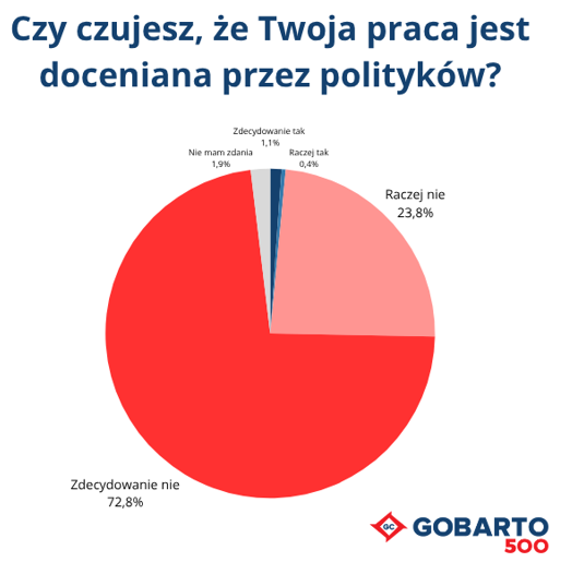 Z ankiety przeprowadzonej na początku 2026 roku przez Gobarto Hodowca wśród 250 producentów trzody chlewnej wynika, że sektor mierzy się z narastającym rozdźwiękiem między swoją strategiczną rolą a społecznym odbiorem. Aż 86,2% rolników uważa, że ich praca nie jest doceniana przez społeczeństwo, a jeszcze bardziej krytycznie oceniane są relacje z politykami – 96,6% respondentów wskazuje na brak uznania z ich strony.