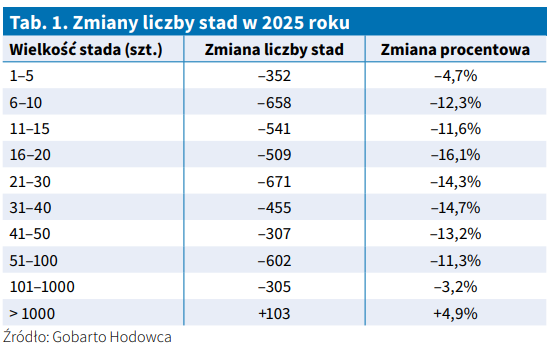 Zmiany w liczbie stad znajdują bezpośrednie odzwierciedlenie w strukturze pogłowia. W chlewniach do 5 świń ubyło 1106 zwierząt (–5,3%), a w przedziałach 6–10 oraz 11–15 świń odpowiednio 5186 sztuk (–12,18%) i 6953 sztuki (–11,62%). Bardzo wyraźne spadki odnotowano również w przedziale 16–20 świń – tam pogłowie zmniejszyło się o 9283 sztuki (–16,39%).