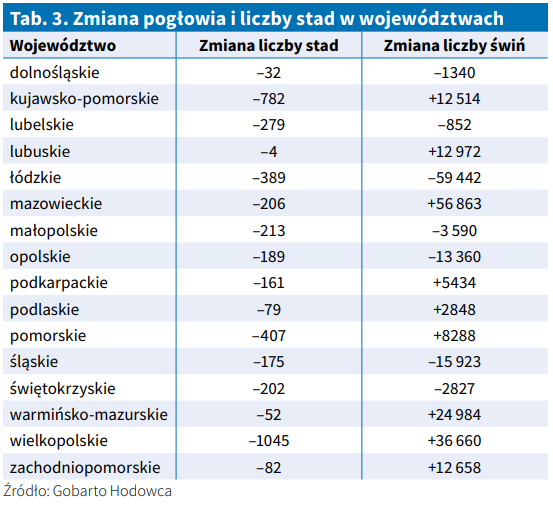 Z drugiej strony wyraźnie rysują się województwa przejmujące dziś ciężar krajowej produkcji. Największy przyrost pogłowia odnotowano w województwach mazowieckim (+56,8 tys. świń) i wielkopolskim (+36,7 tys.), co potwierdza, że Wielkopolska wciąż ma kluczową rolę w produkcji trzody chlewnej. Silny wzrost zanotowało także województwo warmińsko-mazurskie, gdzie pogłowie zwiększyło się o prawie 25 tys. świń. Wzrosty zanotowano także w Kujawsko-Pomorskiem, Zachodniopomorskiem i Lubuskiem.