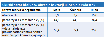 Według Mateusza Porowskiego utrata białka na poziomie 6,9% określana jest jako mała, gdyż pęcherzyki o średnicy powyżej 4 mm, czyli dające największe prawdopodobieństwo dobrze rozwiniętych komórek jajowych w czasie rui, stanowią 55,4%. Natomiast przy utracie 15,8% białka stanowią one tylko 25,6%. To przyczyna zmniejszonej liczebności drugiego miotu. Ponadto wszelkie ograniczenia żywienia w okresie laktacji i po odsadzeniu prosiąt zwiększają liczbę dni do pokrycia, zmniejsza się współczynnik owulacji oraz zwiększa zamieralność zarodków – nawet o 25%. Dłuższa przerwa pomiędzy odsadzeniem prosiąt a wystąpieniem rui może oznaczać gorsze wyniki reprodukcyjne.